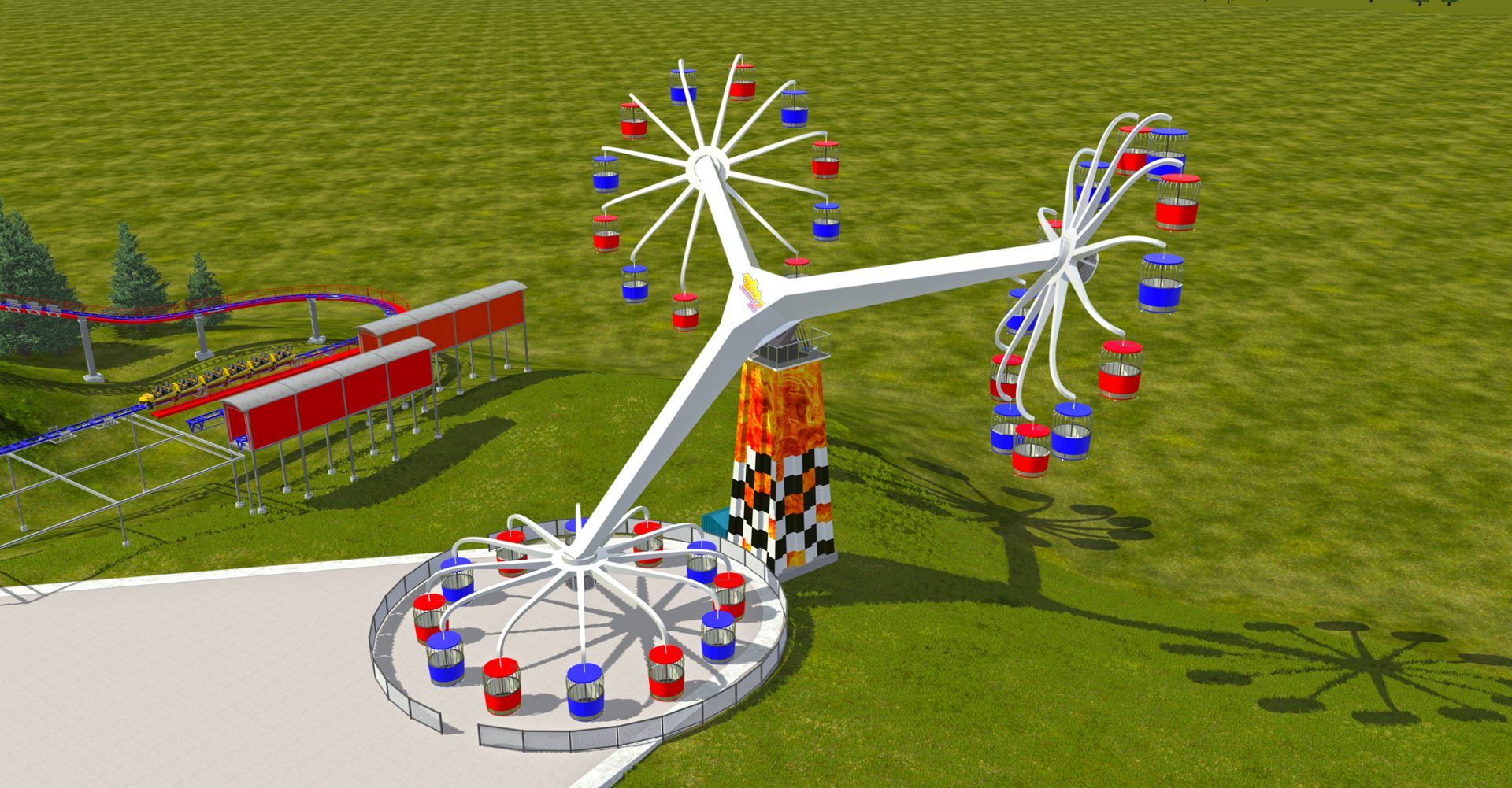 Sky Whirl is my very first project, it started it all! I knew I had the potential to create something grand, but I did not want to select a ride that was “easy to do”, referring to rotations across a single axis or motion along a straight path. Sky Whirl once operated at Six Flags Great America, I remember being in awe at its intricacies, then being nauseated from actually riding it. I missed the ride upon its removal, and I have always held it in a special place. This project had the most restarts as there was not a ton of media or information on it, size references being one of the most challenging aspects, fine-tuning it with each restart was a necessary process in for its final form.