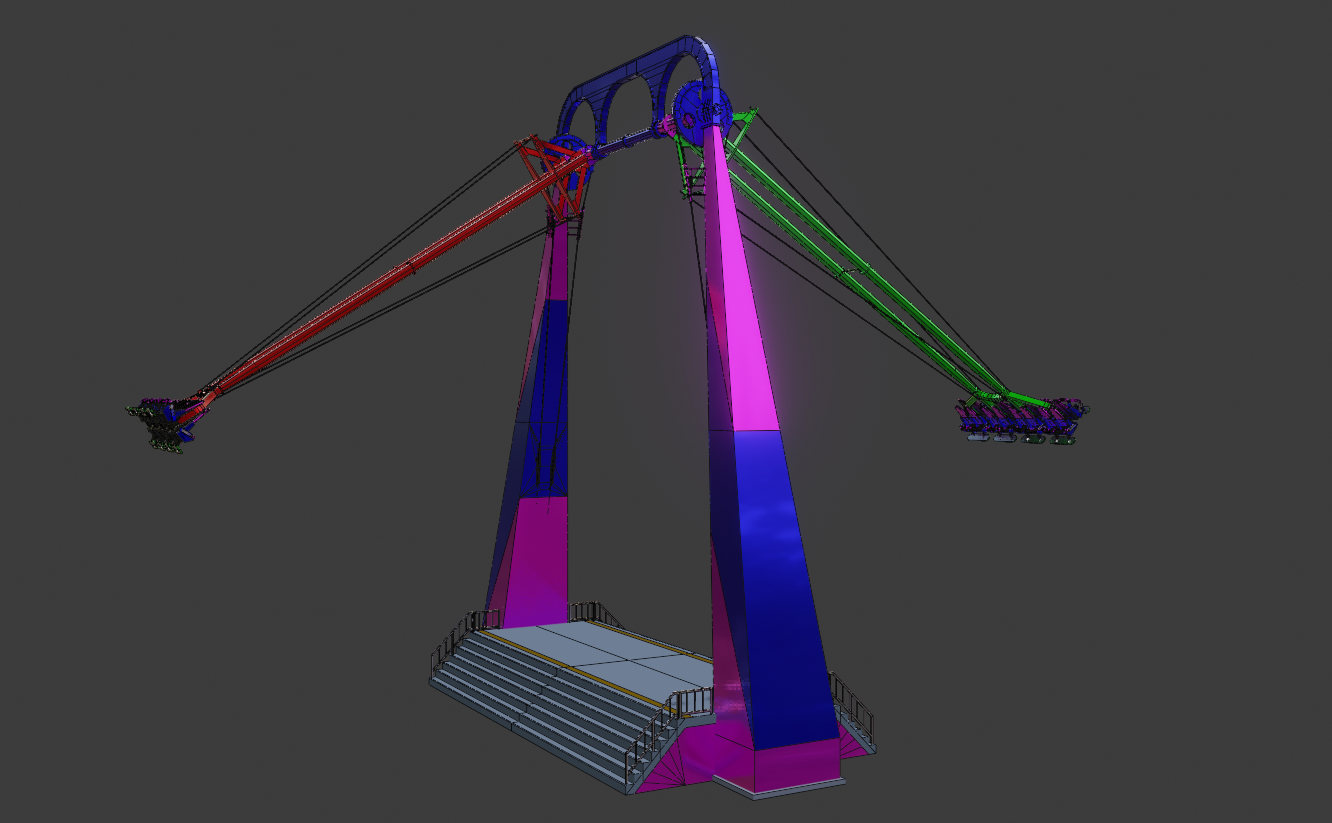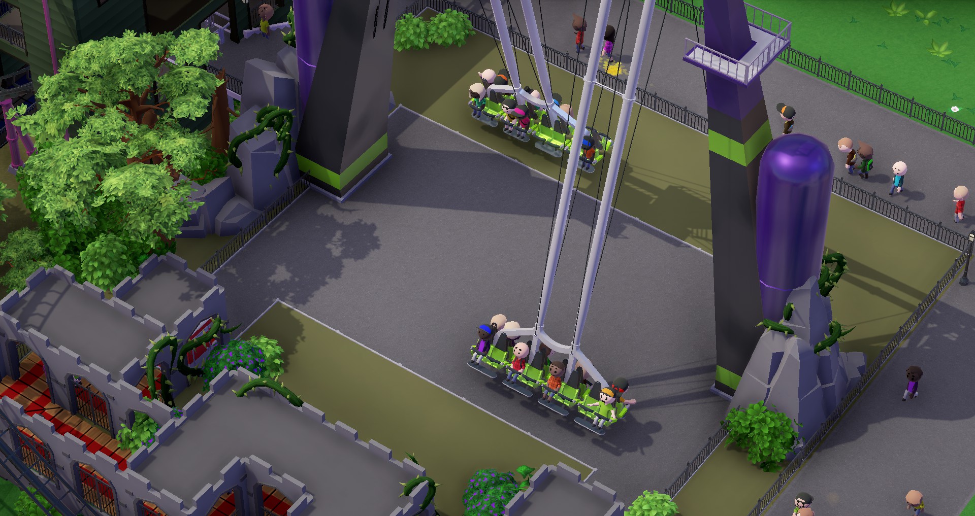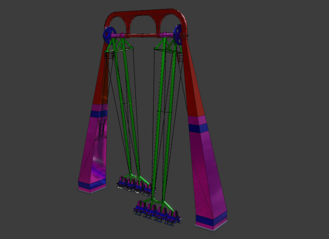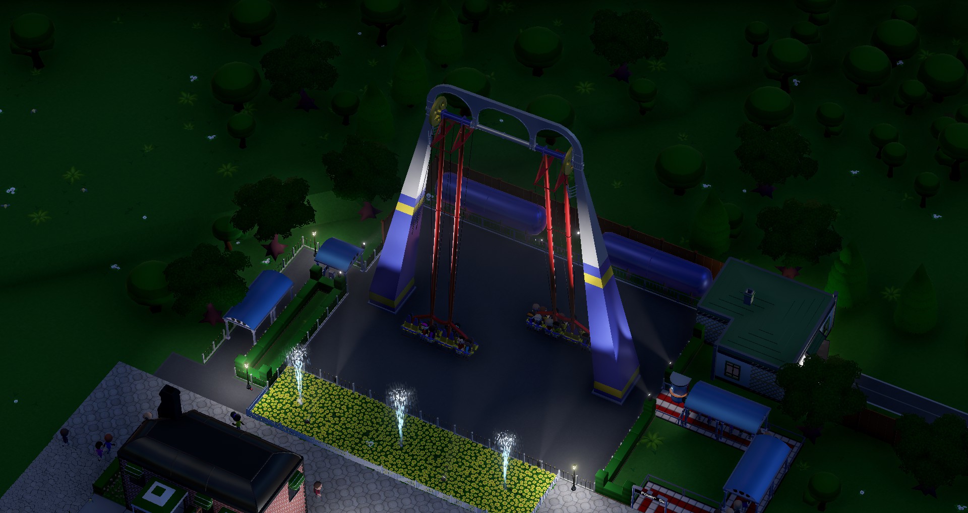 Power Swing, the larger variant, was requested a few times by the Parkitect community. I had ridden the SkyHawk attraction at Cedar Point as a child and was flooded by nostalgia, I had to create the ride. As it’s a fairly simple ride to model and animate, I felt like the entire package needed a little more. The smaller variant, Mega Swing, was also suggested. Mega Swing is based off of Busch Gardens Williamsburg’s Finnegan’s Flyer.